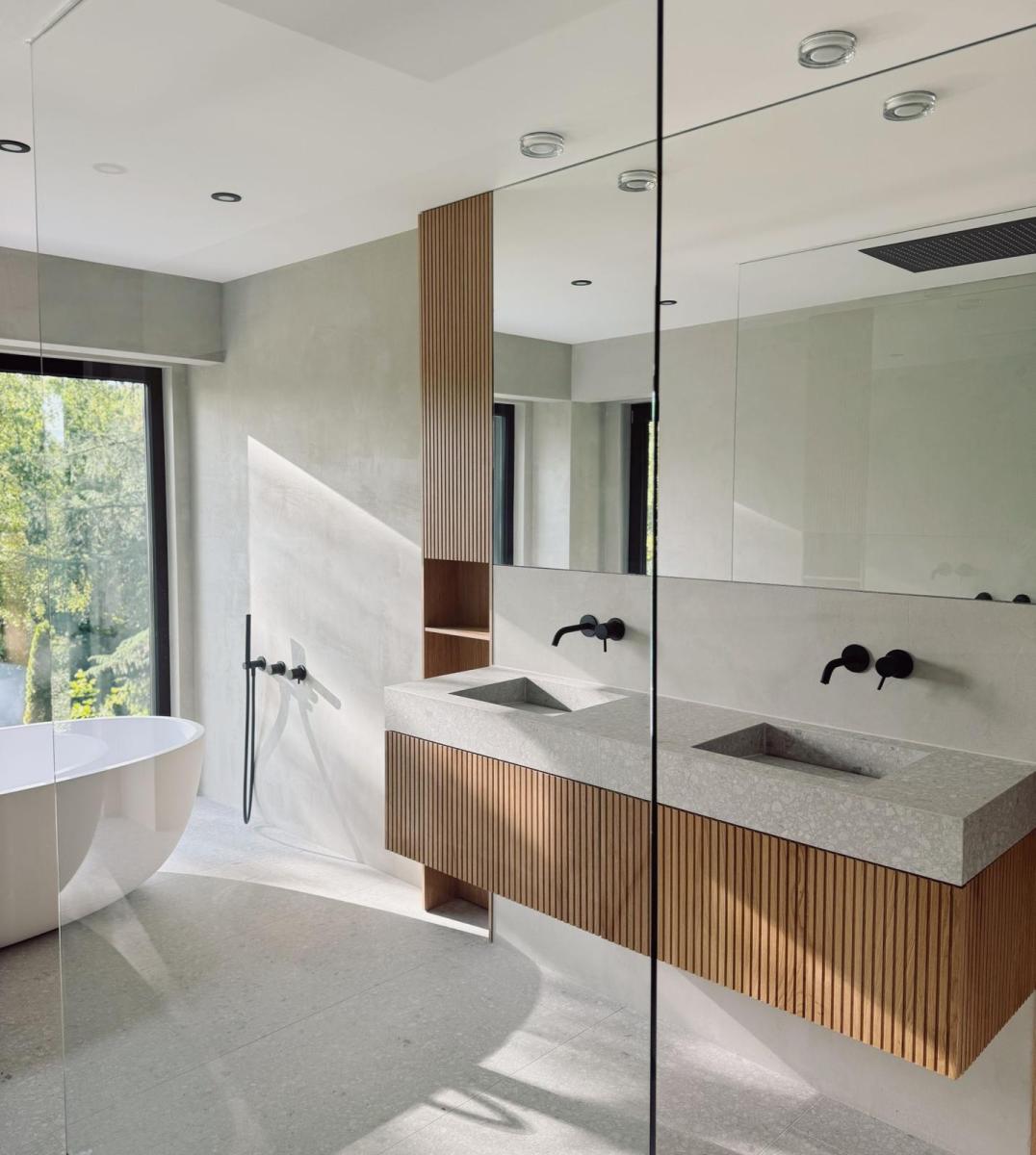 Eichen Handtuch Regaleschränke in die Wand integriert mit passender Rillen-Optik.
